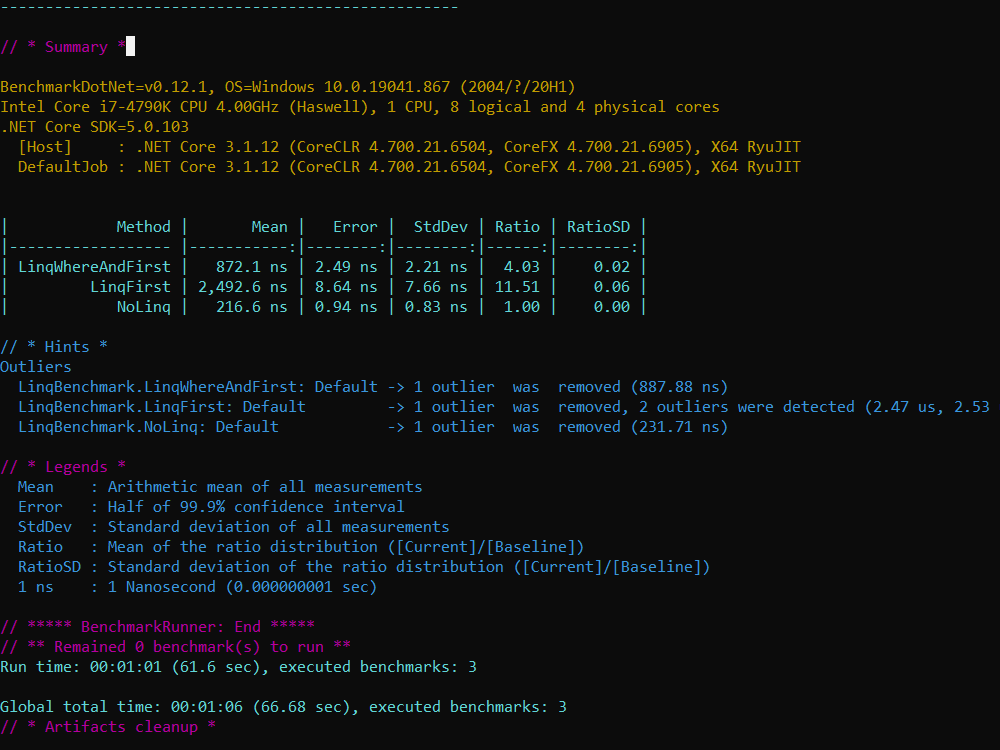 Aqui temos apenas uma chamada para o método Run do executor de benchmarks, especificando o tipo LinqBenchmark que criamos acima.