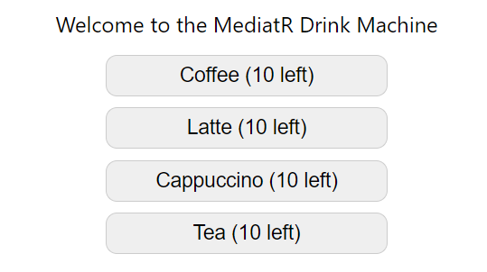 Nossa aplicação de exemplo será uma máquina de servir bebidas quentes, como aquelas que encontramos em escritórios ou lojas de conveniência. Ela vai oferecer apenas quatro tipos de bebiba (café, latte, cappuccino e chá), e apresentará um contador de doses restantes para cada bebiba. Como a intenção é demonstrar as formas mais básicas de uso do MediatR, tomamos o cuidado de deixar a aplicação o mais simples possível.